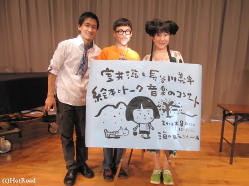 『しげちゃん』一座 絵本LIVE in 海の見えるホール 2012/8/27スタッフ 8月26日(日)海の見えるホール(神奈川県大磯町)にて、『しげちゃん』一座の絵本LIVEが開催されました。この日のメンバーは写真左から、大友剛さん(ピアニスト)、長谷川義史さん(絵本作家)とムロイの3人。昨年より全国各地に伺わせていただいておりますが、関東では初の絵本LIVE。お集まり頂いた大勢のお客様の温かい声援を受け、心のこもったパフォーマンスを披露するメンバー。素敵な絵本LIVEでした。