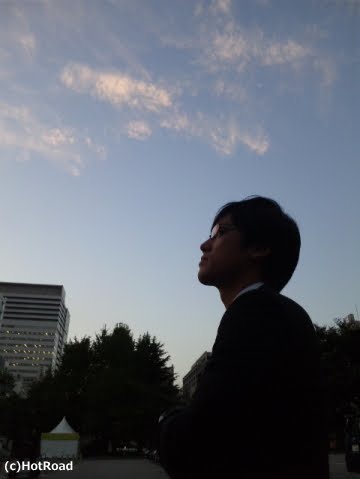写真は、撮影の合間夕暮れ時、空や雲の色が刻々と変わってゆくのを眺めているところをパチリ。